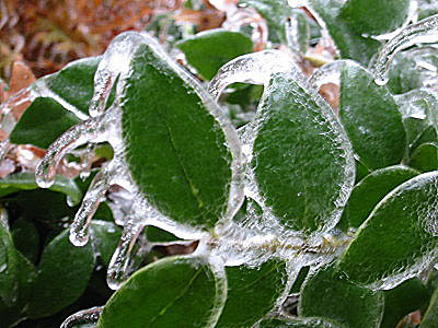It had, in fact, coated everything outside, causing that which was bendable to bend. This picture isn't sideways, the icicles froze bent as the branch was bending from the weight of the ice accumulation.